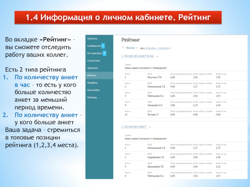 Слайд 211.4 Информация о личном кабинете. Рейтинг