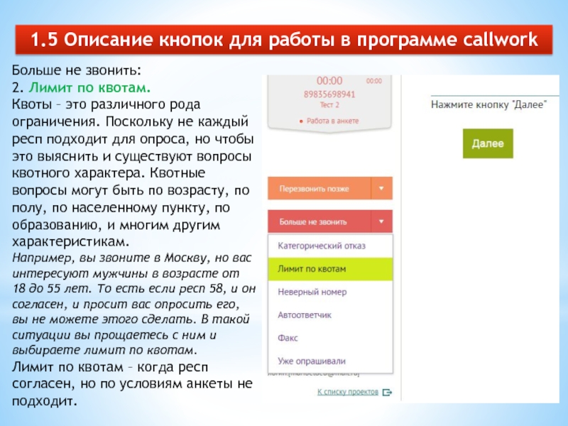 Слайд 351.5 Описание кнопок для работы в программе callwork