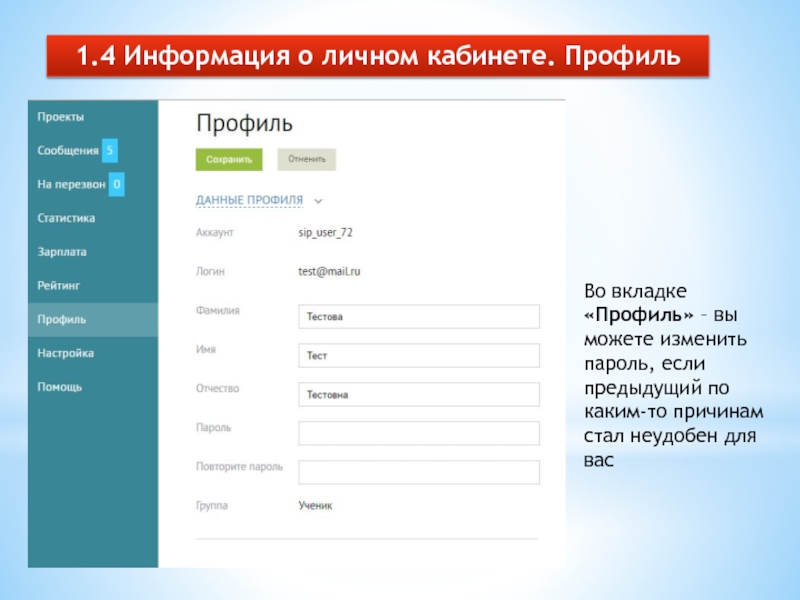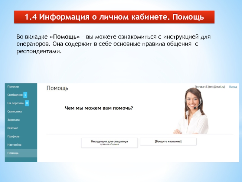 Слайд 241.4 Информация о личном кабинете. Помощь