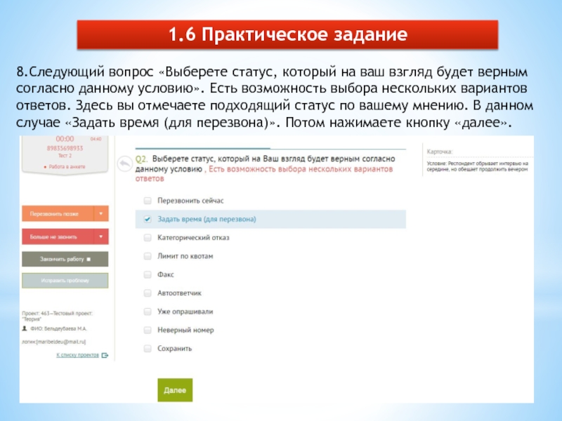 верным согласно данному условию». Есть возможность выбора нескольких вариантов ответов. Здесь вы отмечаете подходящий статус по вашему мнению. В данном случае «Задать время (для перезвона)». Потом нажимаете кнопку «далее».