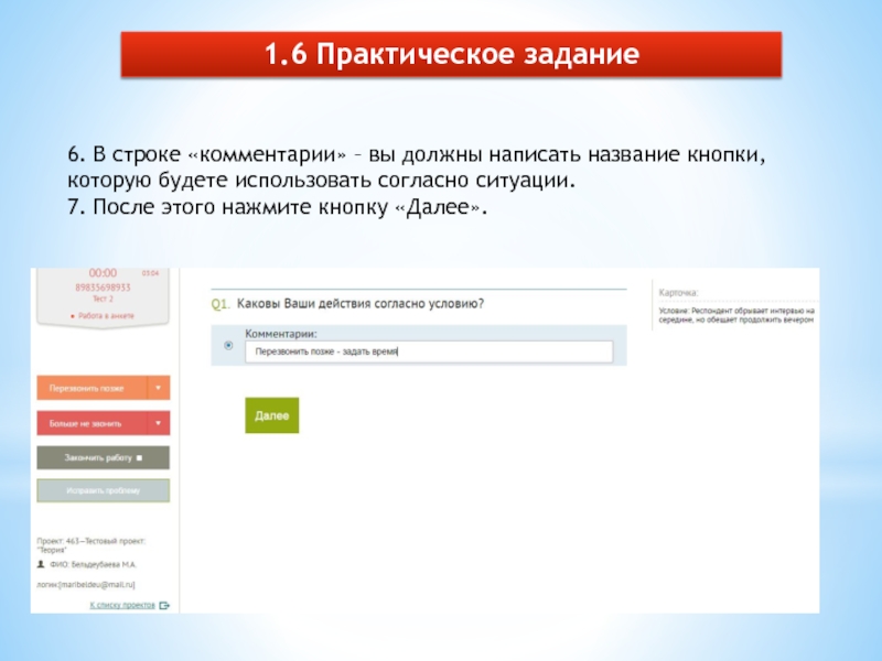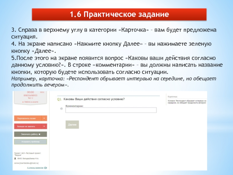 По данному проекту вы будете совершать только звонки в режиме теста – то есть соединения с респондентом не будет, вы не будете разговаривать ни с кем, вы только будете отрабатывать практические навыки, какую кнопку в какой ситуации нажимать.