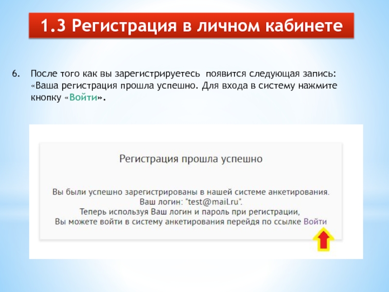 запись: «Ваша регистрация прошла успешно. Для входа в систему нажмите кнопку «Войти».