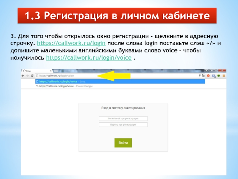 – щелкните в адресную строчку. https://callwork.ru/login после слова login поставьте слэш «/» и допишите маленькими английскими буквами слово voice – чтобы получилось https://callwork.ru/login/voice .
