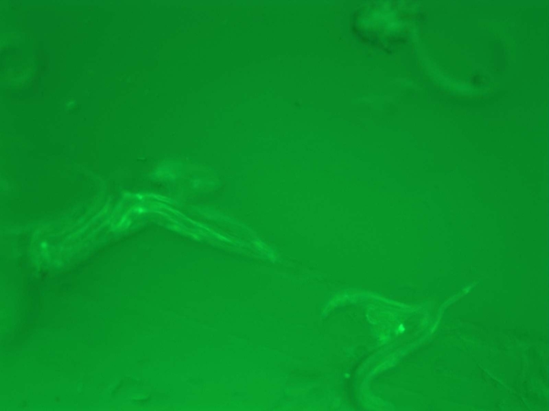 There were eight experimental treatments with 3 replicates of each (Table 1). For full details on synchronization of the colony and plating of strain CL2070, see the Biocore Cellular Biology Lab Manual (Batzli and Harris 2009). On day 6, 200µL of 500µM juglone in 30% DMSO were added to the plates that were to undergo oxidative stress. 100µg/mL of crushed Ginkgold™ dissolved in E. coli were added to appropriate plates. Over the following 6 hours, the mortality rate on each plate was recorded. 6, 12, and 16 hours after addition of the juglone, the plates were observed under the fluorescent microscope to examine expression of GFP. The plates were scored 24 hours after the addition of juglone.