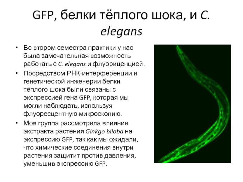 Previous studies have demonstrated that G. biloba extract (EGb761) lessens the effects of cellular stress by means of an unexplained mechanism (Kampkotter et al 2006; Strayer et al 2003; Smith and Luo 2004). It has been suggested that EGb761 acts through the hsp pathway (Strayer et al 2003), but its role as a free radical scavenger may decrease cellular stress in another way (Strayer et al 2003; Kampkotter et al 2006). RNA interference (RNAi) is able to “silence” the expression of a certain gene and thus allow researchers to identify its exact function (Mello and Conte 2004). Using RNAi, could we better examine whether EGb761 decrease stress via a pathway separate to hsp-16.2?