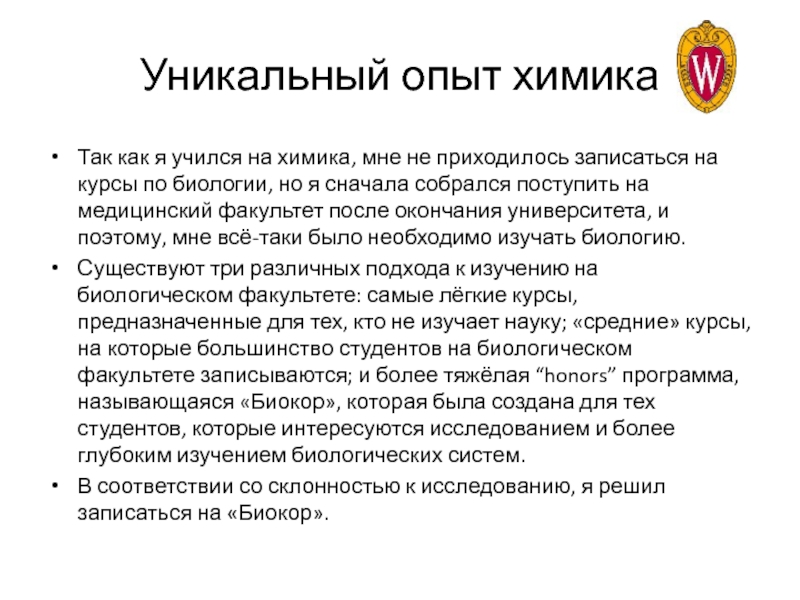 Кроме того, многие американские студенты совмещать разные интересы и учатся на двух факультетах; я, например, окончил университет на факультете химии и на факультете русского языка.