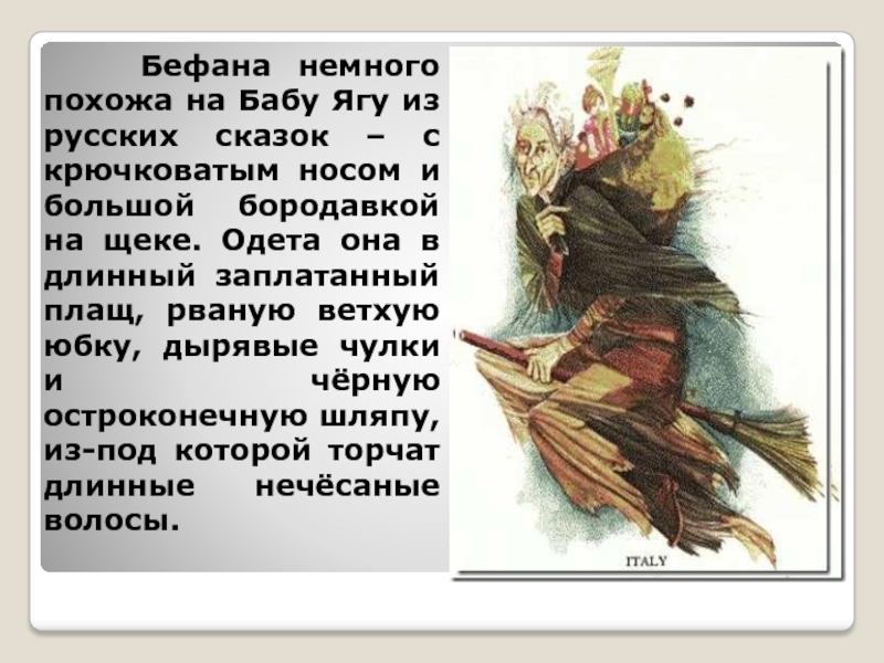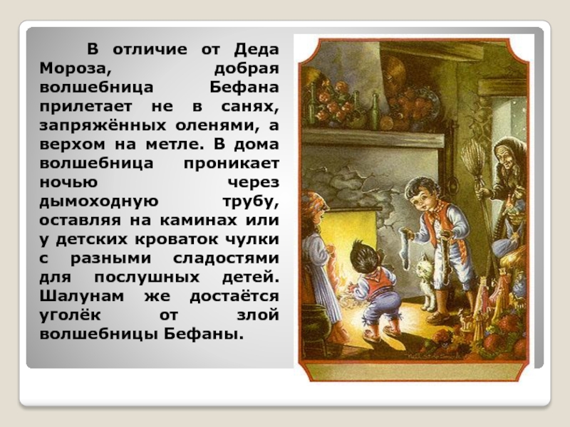 прилетает не в санях, запряжённых оленями, а верхом на метле. В дома волшебница проникает ночью через дымоходную трубу, оставляя на каминах или у детских кроваток чулки с разными сладостями для послушных детей. Шалунам же достаётся уголёк от злой волшебницы Бефаны.