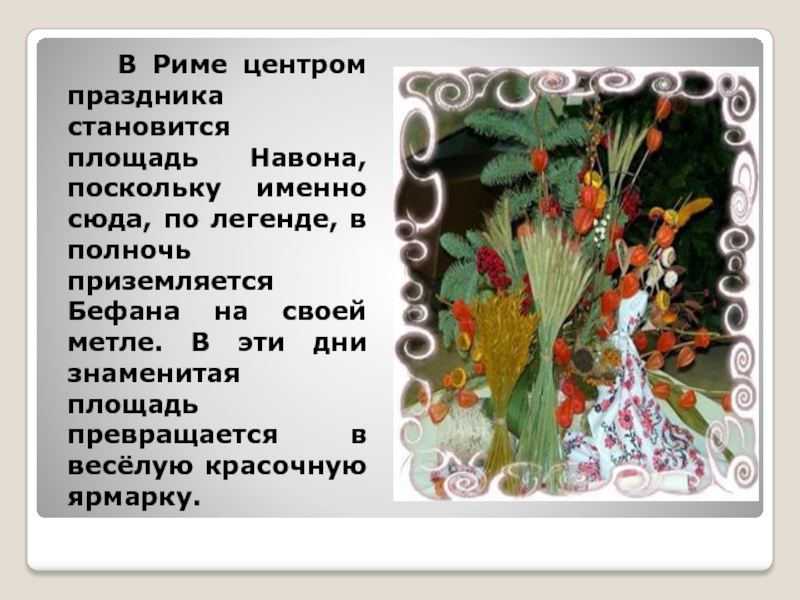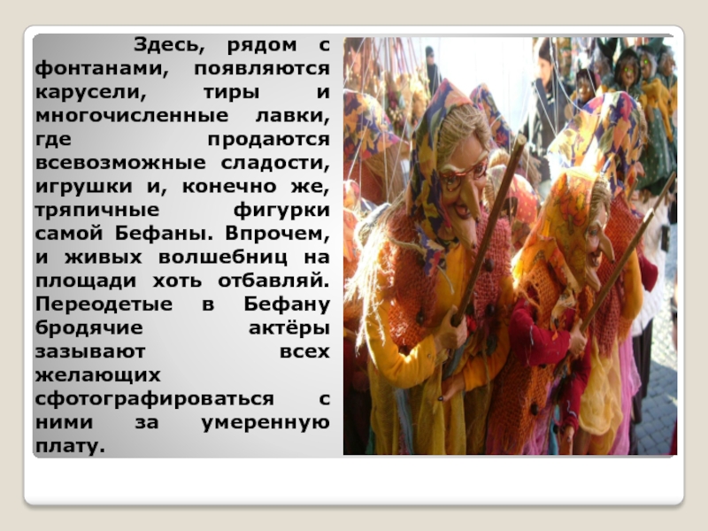 многочисленные лавки, где продаются всевозможные сладости, игрушки и, конечно же, тряпичные фигурки самой Бефаны. Впрочем, и живых волшебниц на площади хоть отбавляй. Переодетые в Бефану бродячие актёры зазывают всех желающих сфотографироваться с ними за умеренную плату.