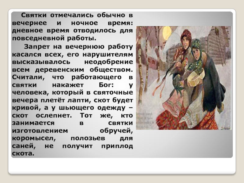 Запрет на вечернюю работу касался всех, его нарушителям высказывалось неодобрение всем деревенским обществом. Считали, что работающего в святки накажет Бог: у человека, который в святочные вечера плетёт лапти, скот будет кривой, а у шьющего одежду – скот ослепнет. Тот же, кто занимается в святки изготовлением обручей, коромысел, полозьев для саней, не получит приплод скота.