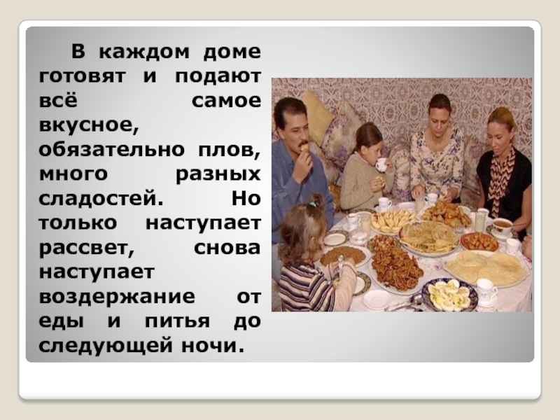 обязательно плов, много разных сладостей. Но только наступает рассвет, снова наступает воздержание от еды и питья до следующей ночи.