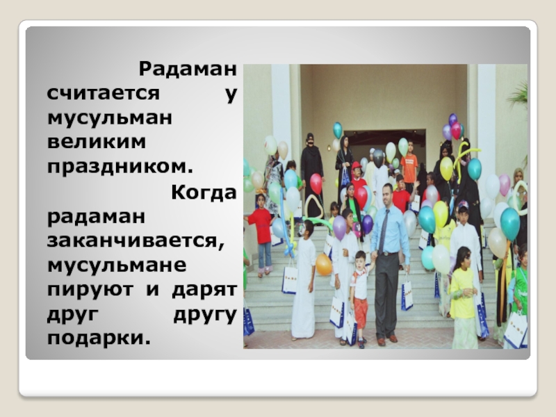 Когда радаман заканчивается, мусульмане пируют и дарят друг другу подарки.