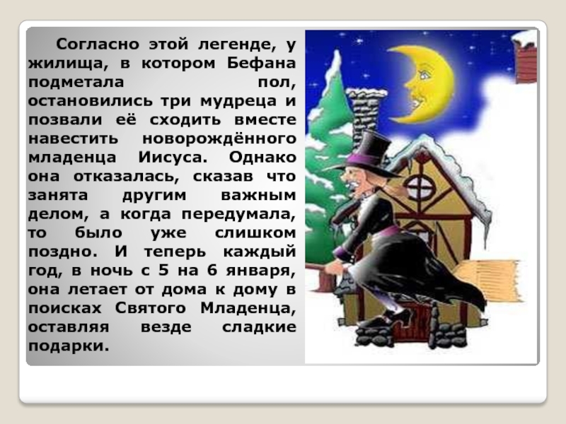 подметала пол, остановились три мудреца и позвали её сходить вместе навестить новорождённого младенца Иисуса. Однако она отказалась, сказав что занята другим важным делом, а когда передумала, то было уже слишком поздно. И теперь каждый год, в ночь с 5 на 6 января, она летает от дома к дому в поисках Святого Младенца, оставляя везде сладкие подарки.