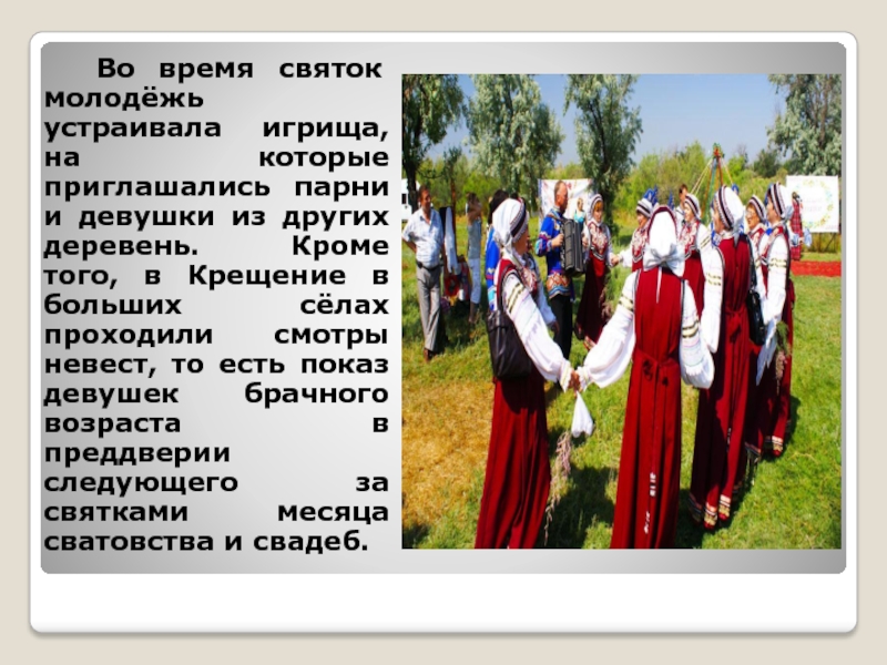 парни и девушки из других деревень. Кроме того, в Крещение в больших сёлах проходили смотры невест, то есть показ девушек брачного возраста в преддверии следующего за святками месяца сватовства и свадеб.