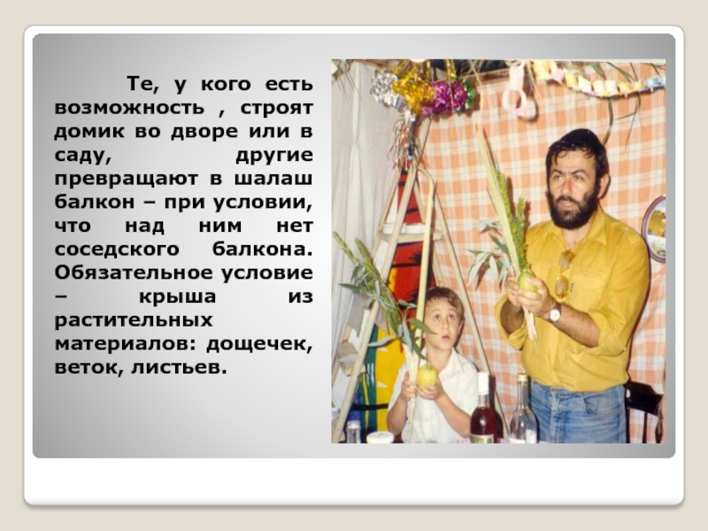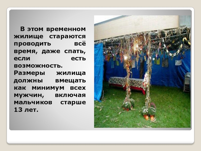 В праздник кущей верующие сооружают шалаш и 7 дней живут в нём. К строительству шалаша многие приступают заранее.