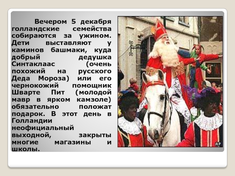ужином. Дети выставляют у каминов башмаки, куда добрый дедушка Синтаклаас (очень похожий на русского Деда Мороза) или его чернокожий помощник Шварте Пит (молодой мавр в ярком камзоле) обязательно положат подарок. В этот день в Голландии неофициальный выходной, закрыты многие магазины и школы.