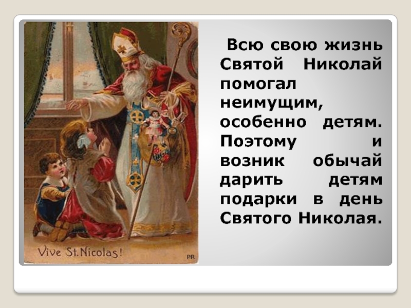 Всю свою жизнь Святой Николай помогал неимущим, особенно детям. Поэтому