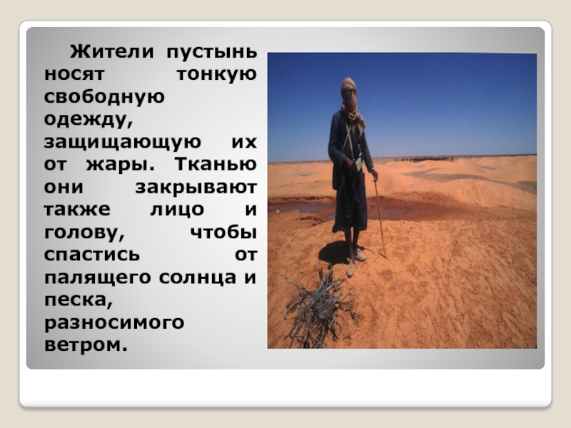 Жители пустынь носят тонкую свободную одежду, защищающую их от