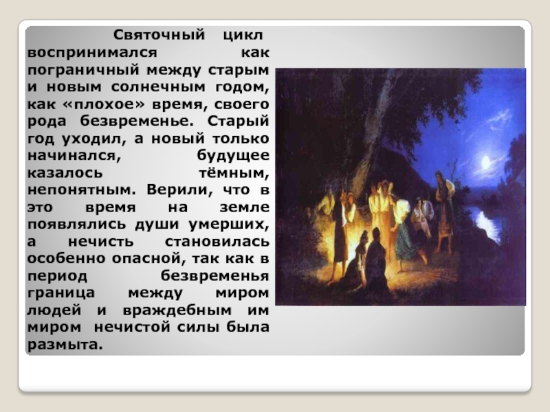 новым солнечным годом, как «плохое» время, своего рода безвременье. Старый год уходил, а новый только начинался, будущее казалось тёмным, непонятным. Верили, что в это время на земле появлялись души умерших, а нечисть становилась особенно опасной, так как в период безвременья граница между миром людей и враждебным им миром нечистой силы была размыта.