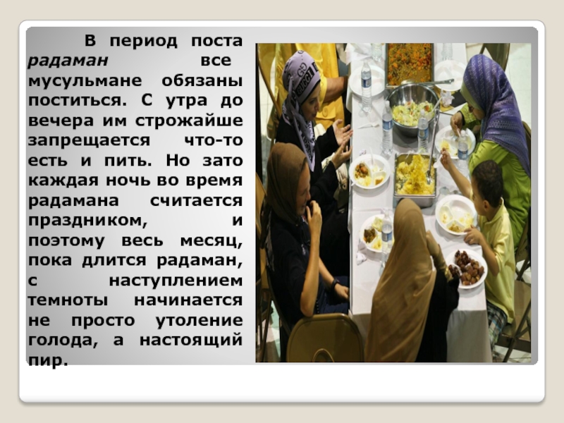 С утра до вечера им строжайше запрещается что-то есть и пить. Но зато каждая ночь во время радамана считается праздником, и поэтому весь месяц, пока длится радаман, с наступлением темноты начинается не просто утоление голода, а настоящий пир.