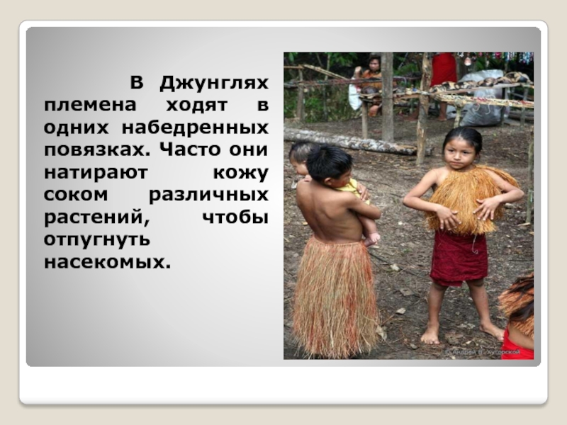 повязках. Часто они натирают кожу соком различных растений, чтобы отпугнуть насекомых.