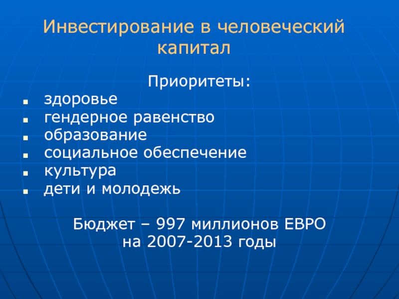 Бюджет – 903 миллиона ЕВРО на 2007-2013 годы