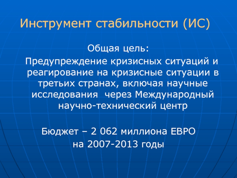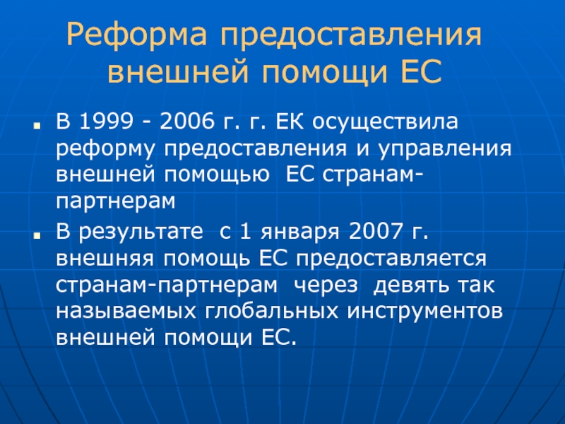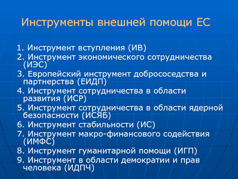 В результате с 1 января 2007 г. внешняя помощь ЕС предоставляется странам-партнерам через девять так называемых глобальных инструментов внешней помощи ЕС.
