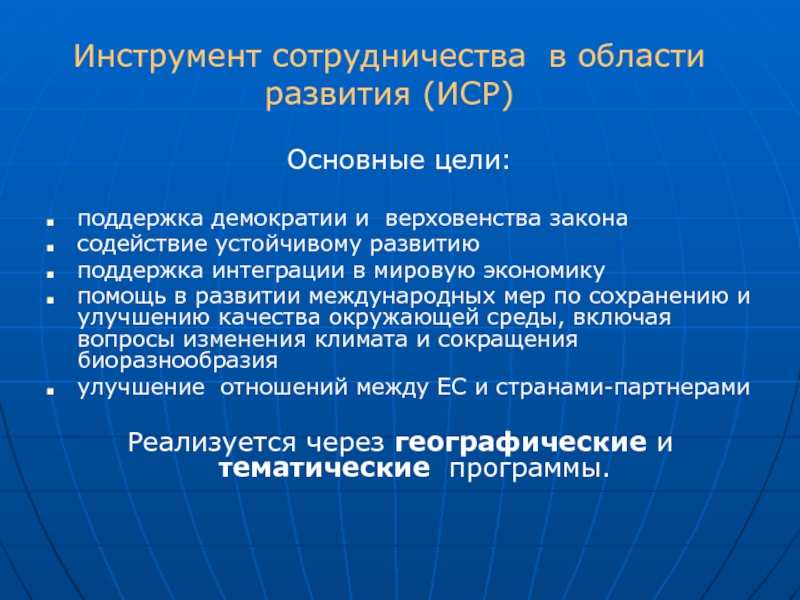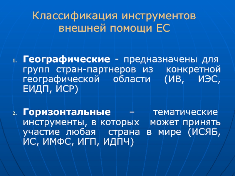 инструментах внешней помощи ЕС за исключением ИВ и ИЭС, поскольку ИВ предназначен для стран-кандидатов на вступление в ЕС и стран-потенциальных кандидатов на вступление в ЕС, а ИЭС – для сотрудничества ЕС с экономически развитыми странами, например, Австралией, США, Японией и др.