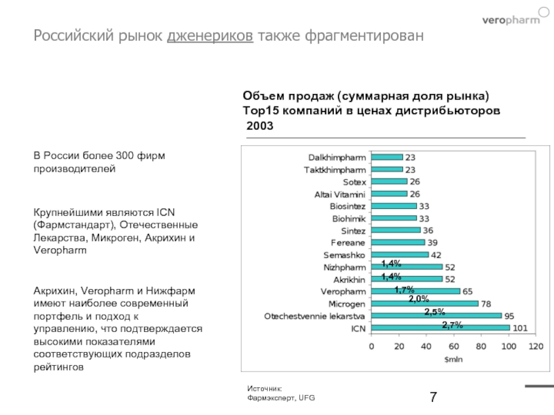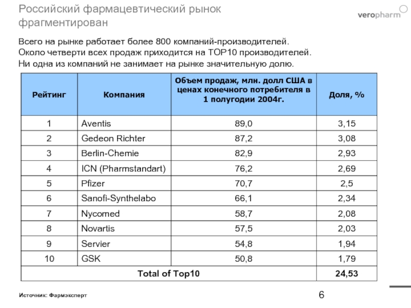 Крупнейшими являются ICN (Фармстандарт), Отечественные Лекарства, Микроген, Акрихин и Veropharm