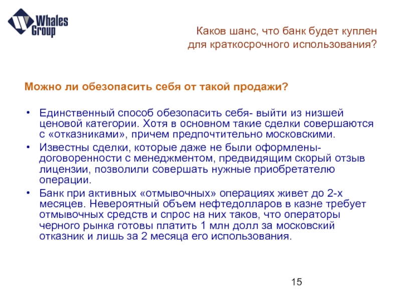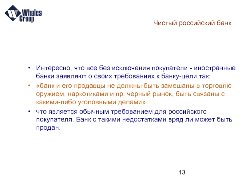 что является обычным требованием для российского покупателя. Банк с такими недостатками вряд ли может быть продан.