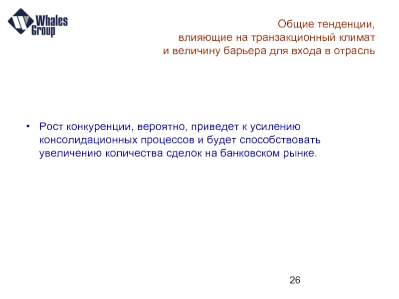 Рост конкуренции, вероятно, приведет к усилению консолидационных процессов и будет способствовать увеличению количества сделок на банковском рынке.