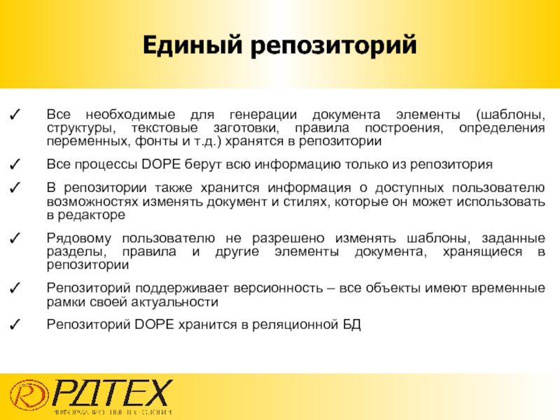 Рядовому пользователю не разрешено изменять шаблоны, заданные разделы, правила и другие элементы документа, хранящиеся в репозитории