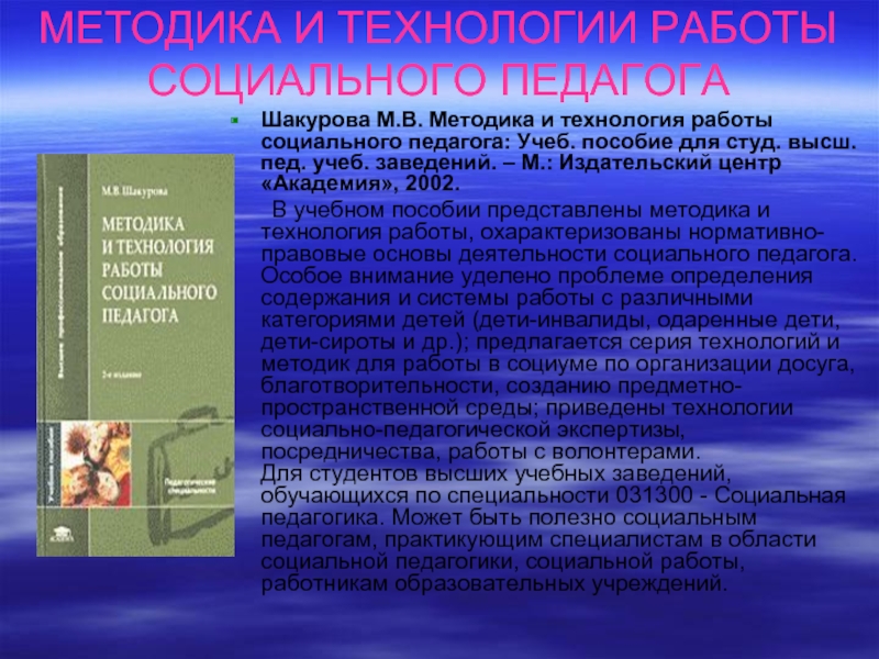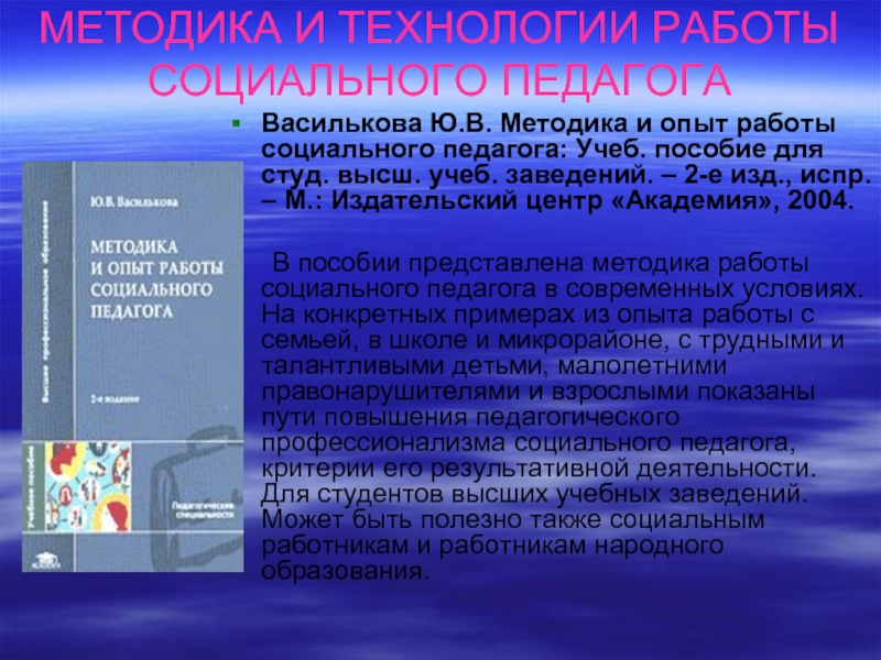 технология работы социального педагога: Учеб. пособие для студ.высш. пед. учеб. заведений/ Под ред. В.А. Сластенина. – М.: Издательский центр «Академия», 2001.