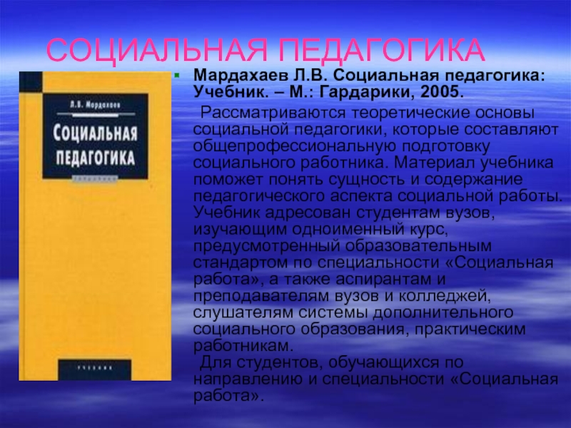 Мардахаев Л.В. Социальная педагогика: Учебник. – М.: Гардарики, 2005.