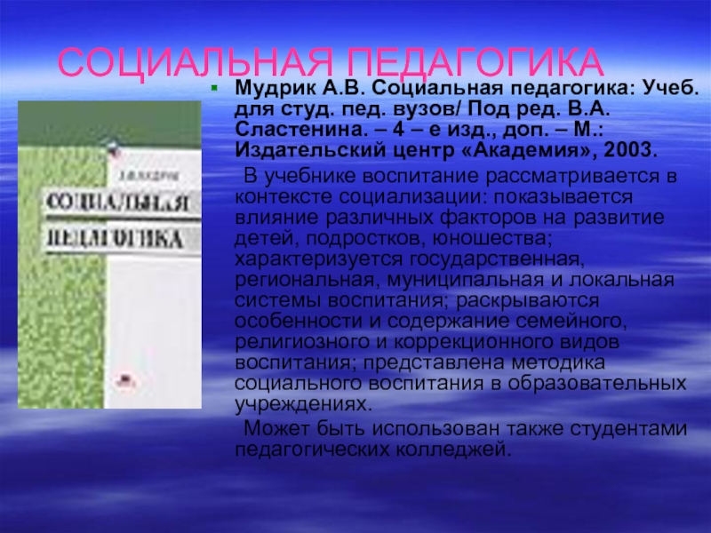 Мудрик А.В. Социальная педагогика: Учеб. для студ. пед. вузов/ Под