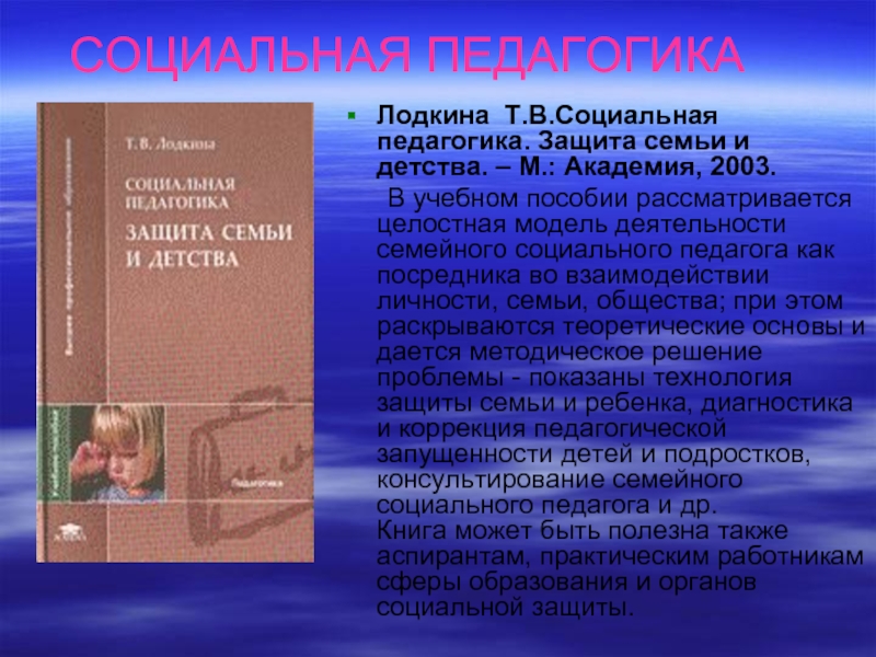 Лодкина Т.В.Социальная педагогика. Защита семьи и детства. – М.: Академия,