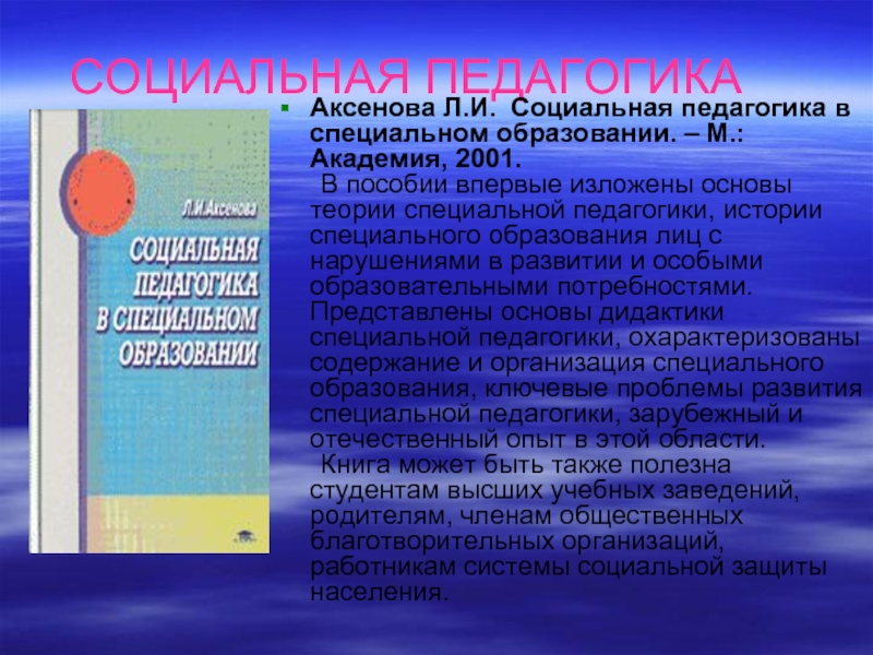 Аксенова Л.И. Социальная педагогика в специальном образовании. – М.: Академия,