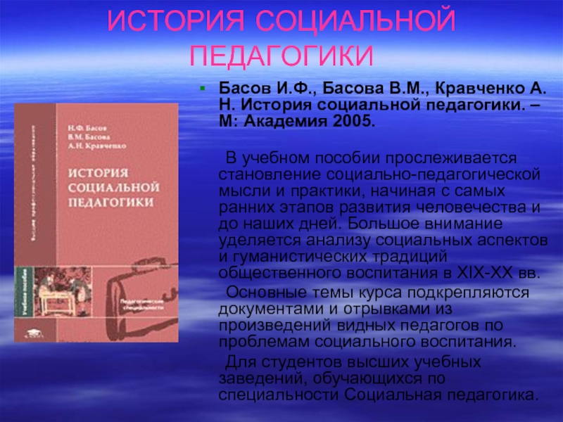 Басов И.Ф., Басова В.М., Кравченко А.Н. История социальной педагогики.