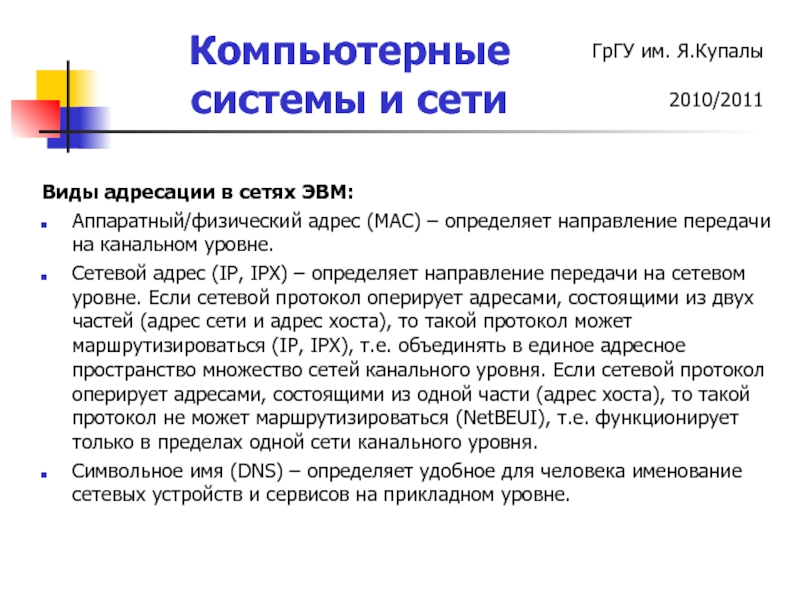 Символьное имя (DNS) – определяет удобное для человека именование сетевых устройств и сервисов на прикладном уровне.