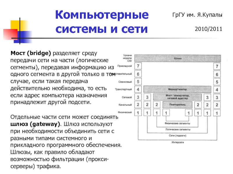 Слайд 38Мост (bridge) разделяет среду передачи сети на части (логические сегменты), передавая