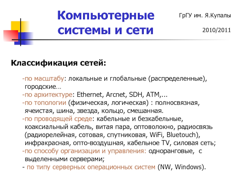 по проводящей среде: кабельные и безкабельные, коаксиальный кабель, витая пара, оптоволокно, радиосвязь (радиорелейная, сотовая, спутниковая, WiFi, Bluetouch), инфракрасная, опто-воздушная, кабельное TV, силовая сеть;