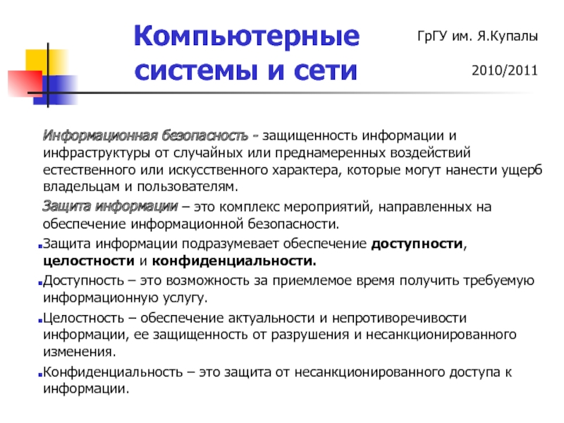 Слайд 39Информационная безопасность - защищенность информации и инфраструктуры от случайных или преднамеренных