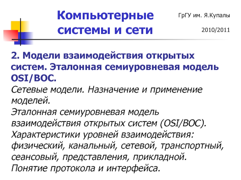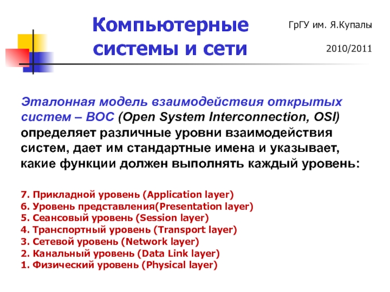 Слайд 9Эталонная модель взаимодействия открытых систем – ВОС (Open System Interconnection, OSI)