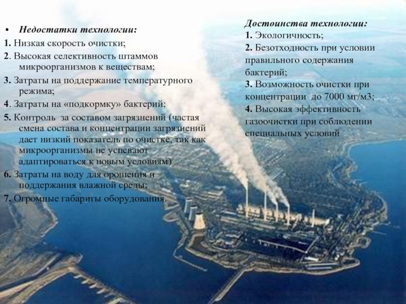 вредных примесей бытового и промышленного происхождения. Данные методы основаны на естественной способности микроорганизмов, образующих биологически активную пленку (biofilm) на поверхности твердого пористого носителя, извлекать из проходящего сквозь этот носитель воздуха примеси органических и неорганических летучих веществ, включая органические вещества искусственного происхождения (ксенобиотики), окислять и разлагать их до воды и углекислого газа.