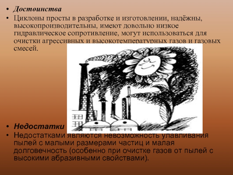 Циклоны просты в разработке и изготовлении, надёжны, высокопроизводительны, имеют довольно низкое
