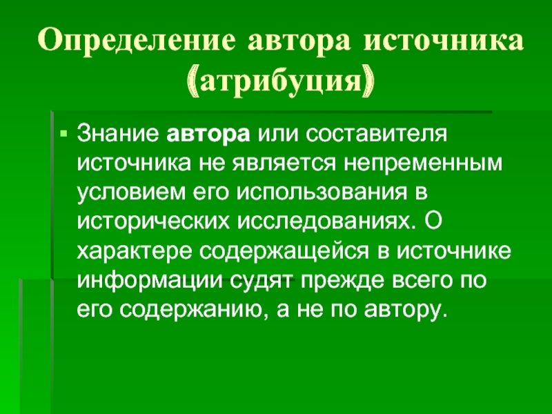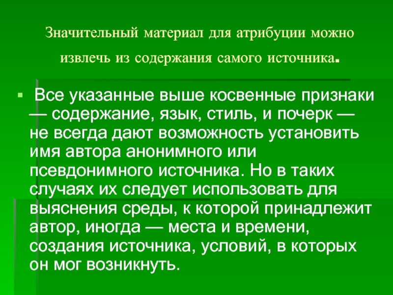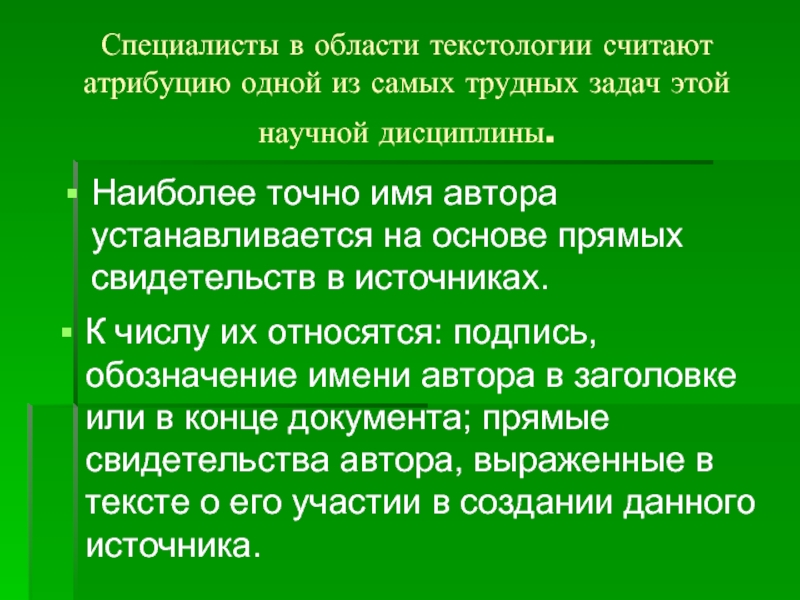 К числу их относятся: подпись, обозначение имени автора в заголовке или в конце документа; прямые свидетельства автора, выраженные в тексте о его участии в создании данного источника.