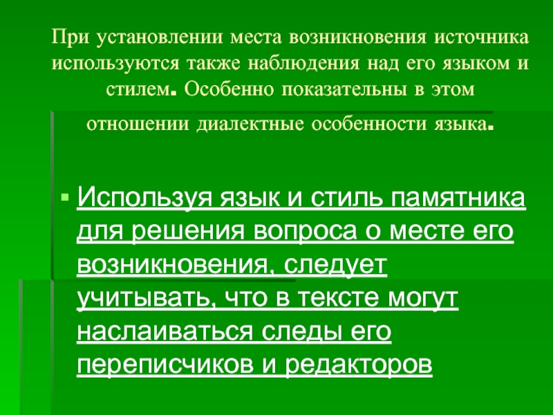 Используя язык и стиль памятника для решения вопроса о месте его возникновения, следует учитывать, что в тексте могут наслаиваться следы его переписчиков и редакторов
