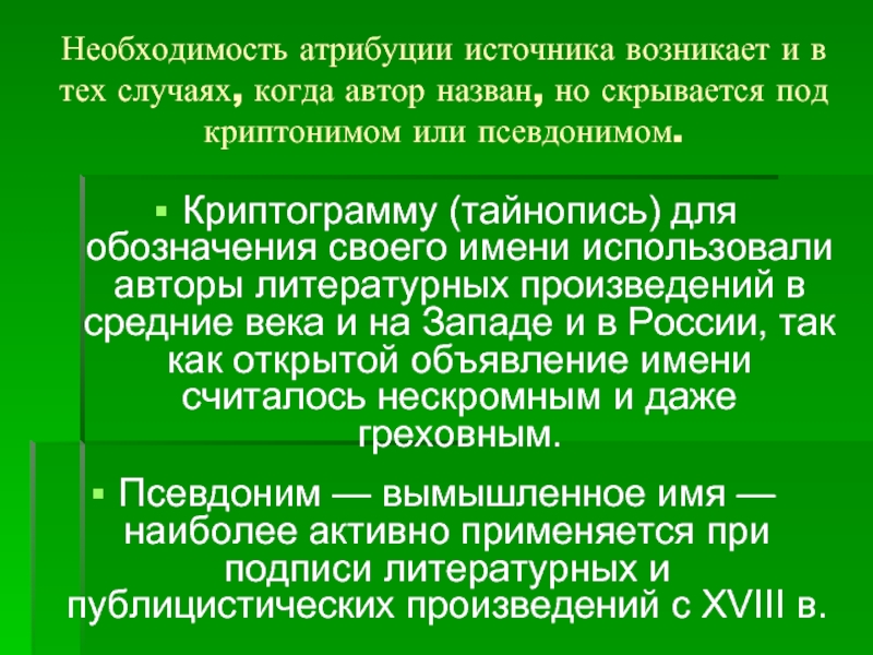 Псевдоним — вымышленное имя — наиболее активно применяется при подписи литературных и публицистических произведений с XVIII в.
