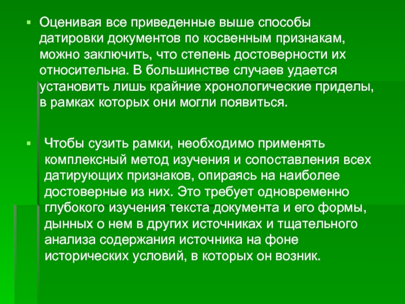 Чтобы сузить рамки, необходимо применять комплексный метод изучения и сопоставления всех датирующих признаков, опираясь на наиболее достоверные из них. Это требует одновременно глубокого изучения текста документа и его формы, дынных о нем в других источниках и тщательного анализа содержания источника на фоне исторических условий, в которых он возник.