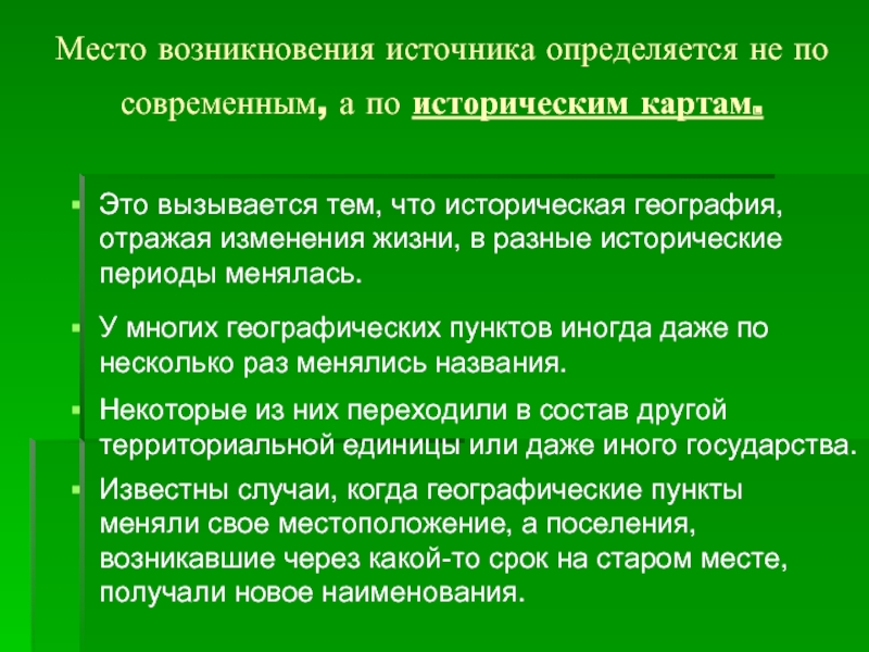 Это вызывается тем, что историческая география, отражая изменения жизни, в разные исторические периоды менялась.