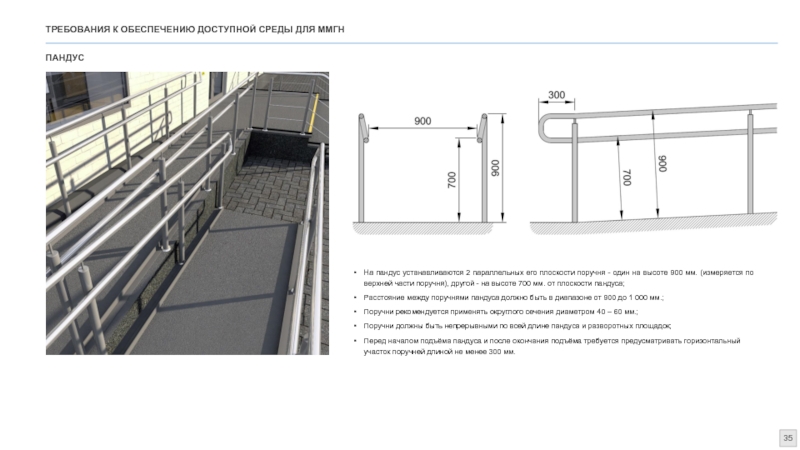 Вдоль всей плоскости пандуса, с двух сторон, обязательно устройство ограничителей («колёсоотбойников») высотой не менее 50 мм.